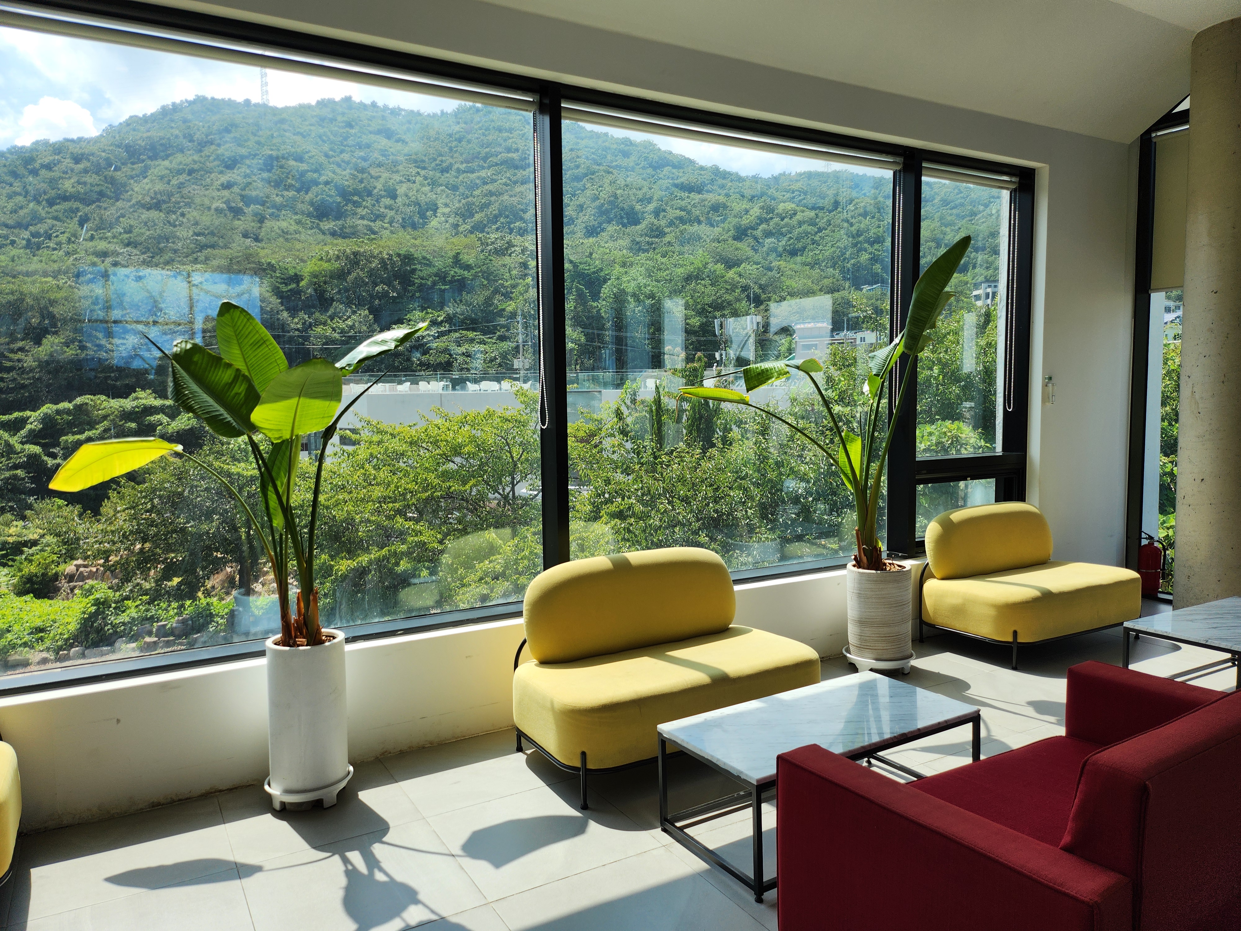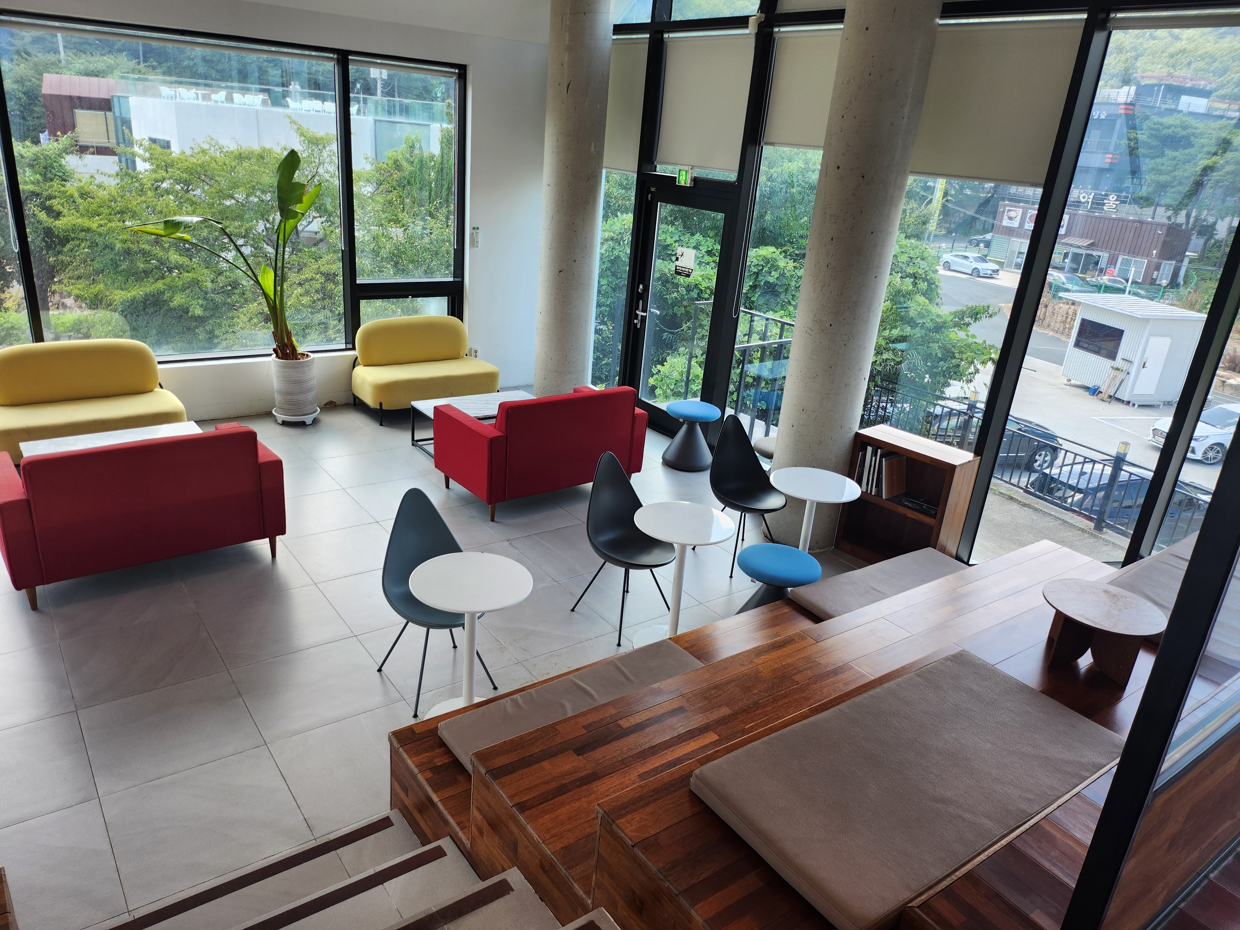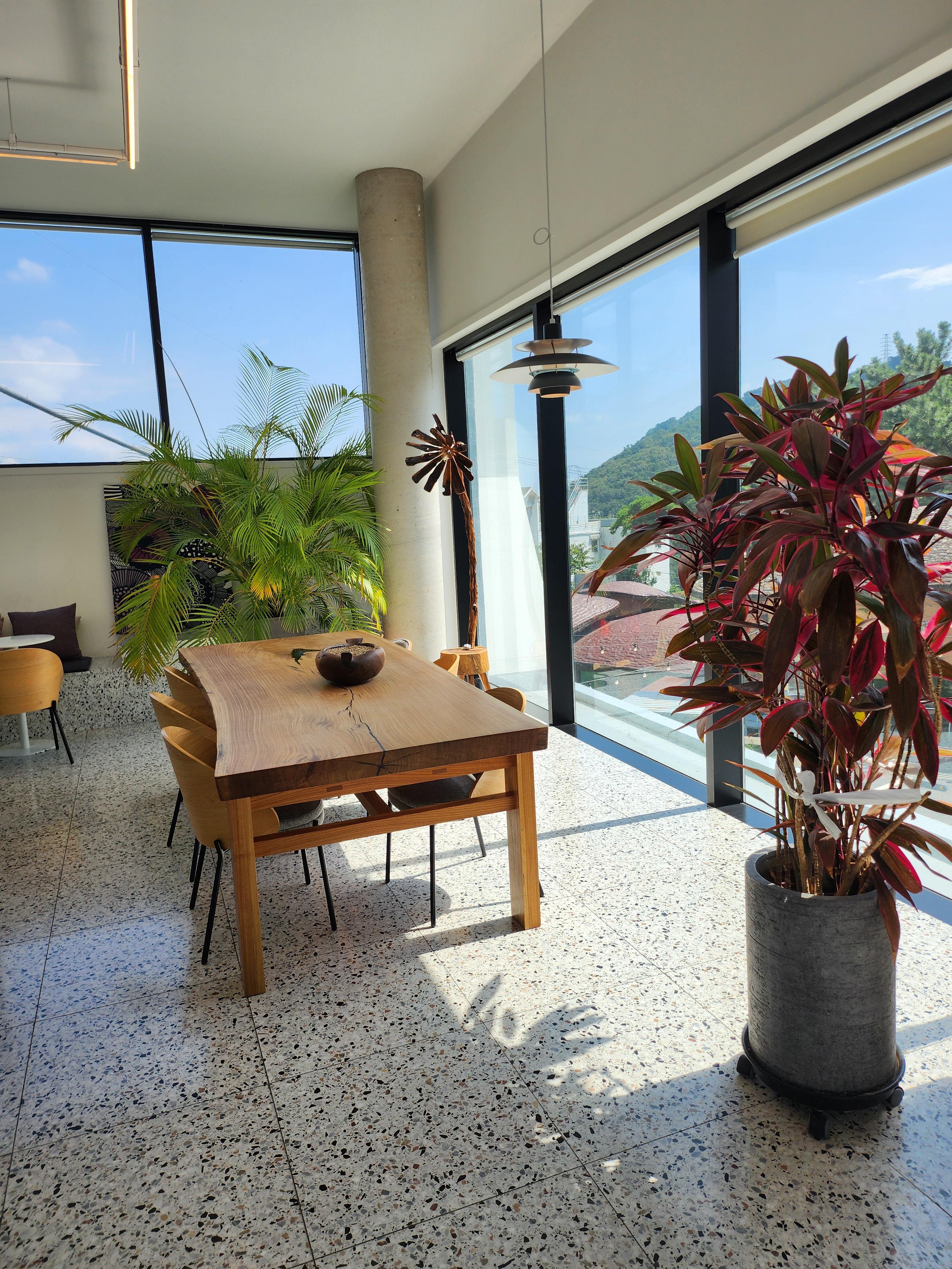실내는 세 구역으로 나누어져 있어 공간이 넓고 여유롭고, 사방이 통유리라 햇살이 가득 들어오며 탁 트인 뷰를 즐길 수 있습니다.