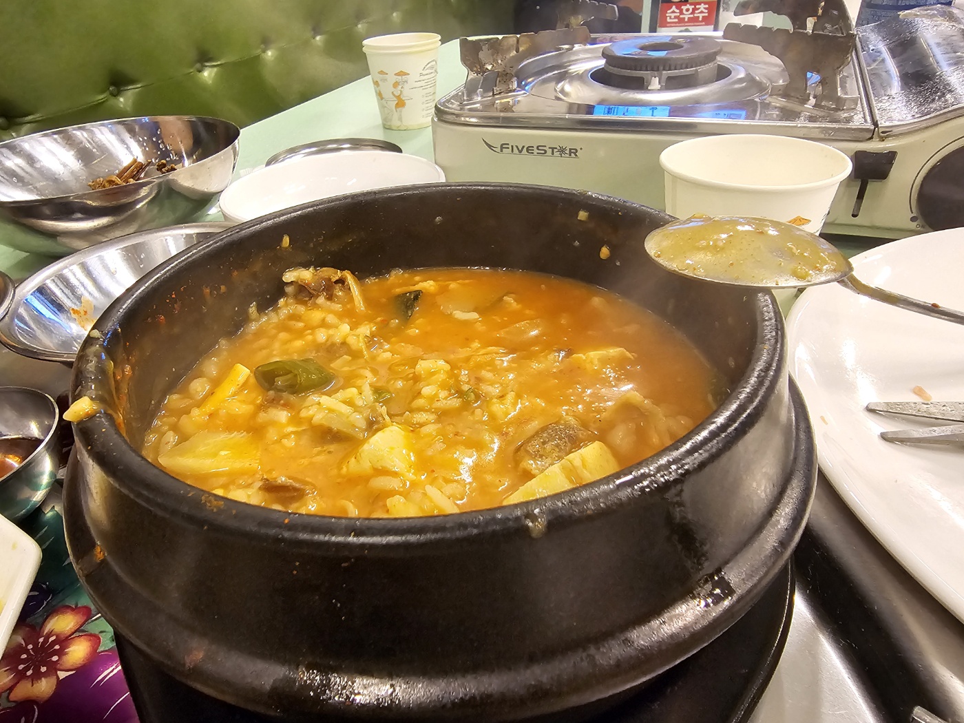 특히 된장찌개는 남은 고기와 땡초를 하나더 썰어 넣고, 밥을 넣고 끓여 먹는 것이 별미였는데요. 밥알 하나하나에 얼큰한 양념이 잘 배어들어 뜨끈한 국밥을 먹는 듯한 든든함과 만족감을 주었습니다. 다들 '이건 꼭 밥을 말아 먹어야 한다'며 숟가락을 놓지 못할 정도였어요. 살짝 맵기도 했지만 아이들도 정말 맛있게 먹었답니다.