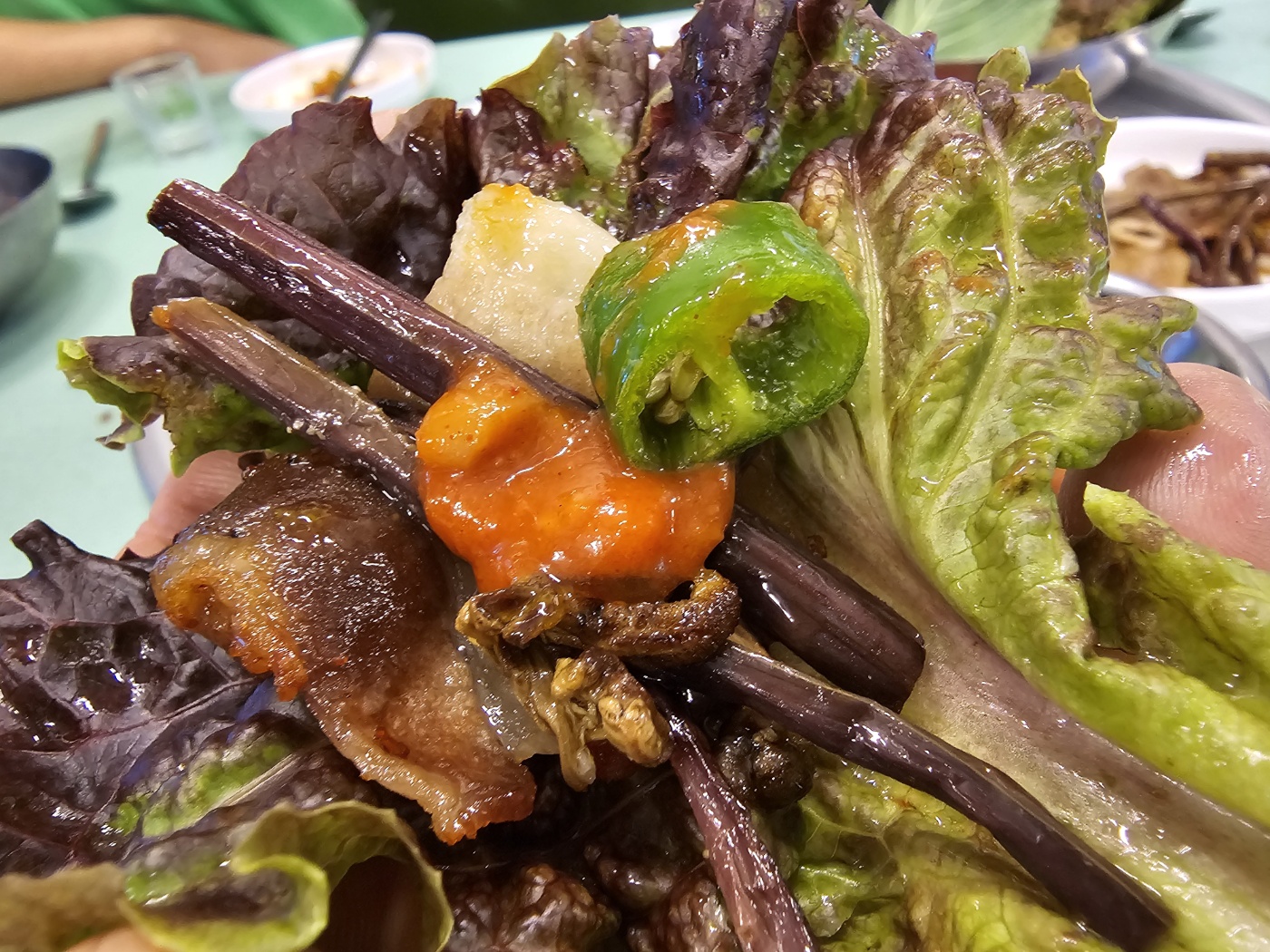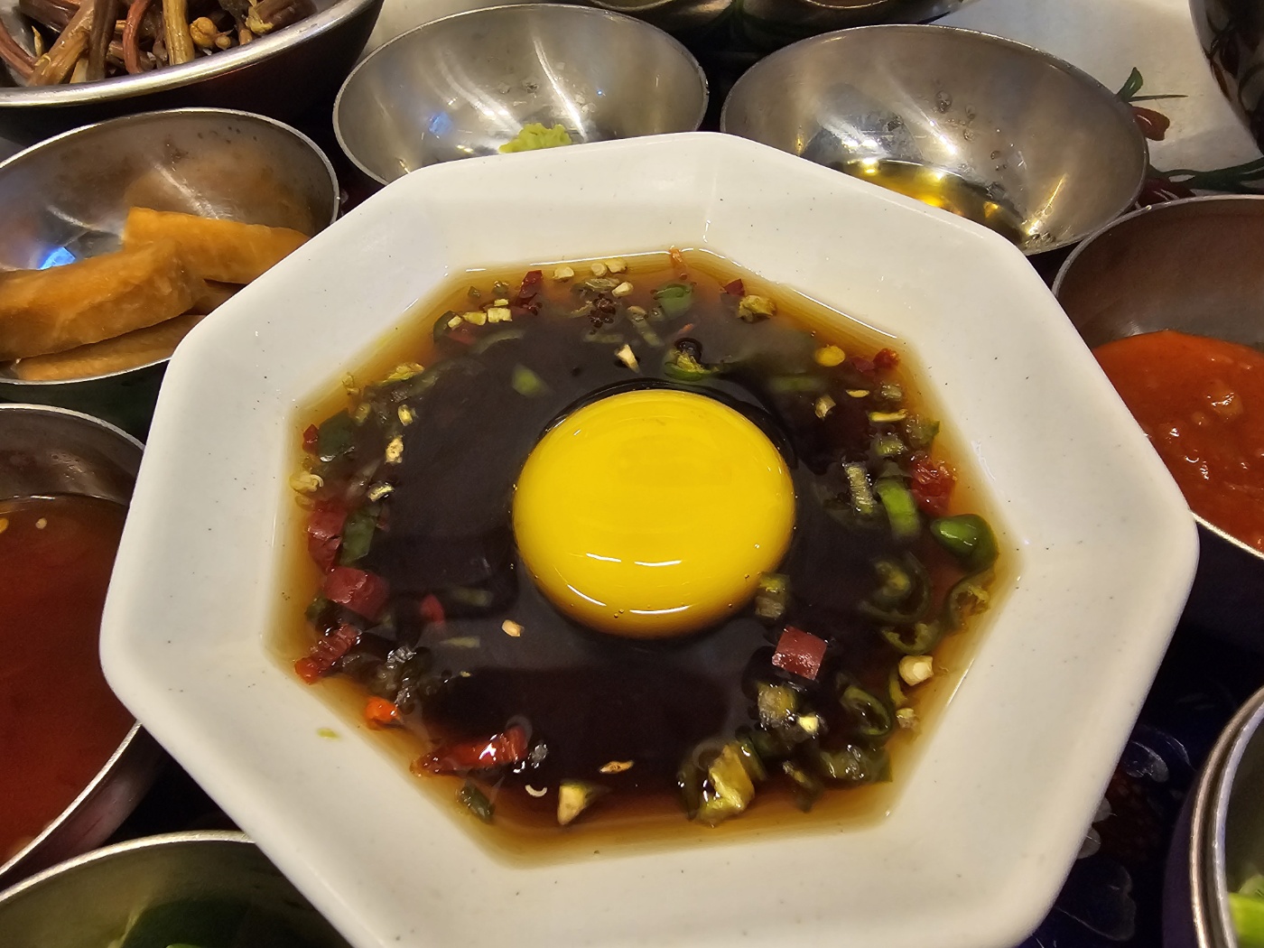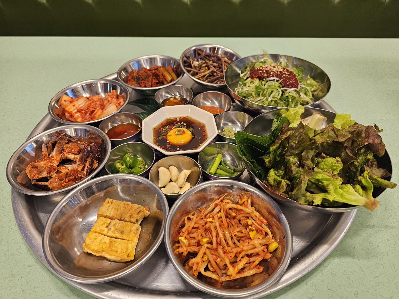쌈 채소는 물론이고, 아삭한 쌈무와 새콤달콤한 파절이, 부드러운 계란말이, 잘 익은 김치, 그리고 고소한 콩나물무침까지. 이뿐만이 아니었어요. 짭조름한 양념이 잘 밴 양념게장은 밥도둑이 따로 없을 정도로 맛있었습니다. 메인 메뉴가 나오기도 전에 이미 기본 찬만으로도 든든하게 배를 채울 수 있을 정도였죠. 정갈하면서도 인심 좋게 차려낸 반찬들을 맛보며, 이 집은 '음식에 진심이구나'라는 생각이 들었습니다